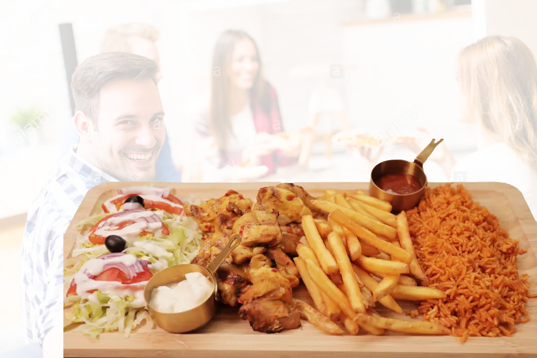 Brochette de poulet grillée au feu, accompagné de riz spécial iranien fait maison, frites, salade, tomates, oignons et sauce.