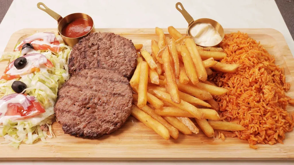 pizzas cuites au four avec la meilleure farine du marché, burgers maison, broches de kebab faites maison et grillades de différentes viandes au feu.